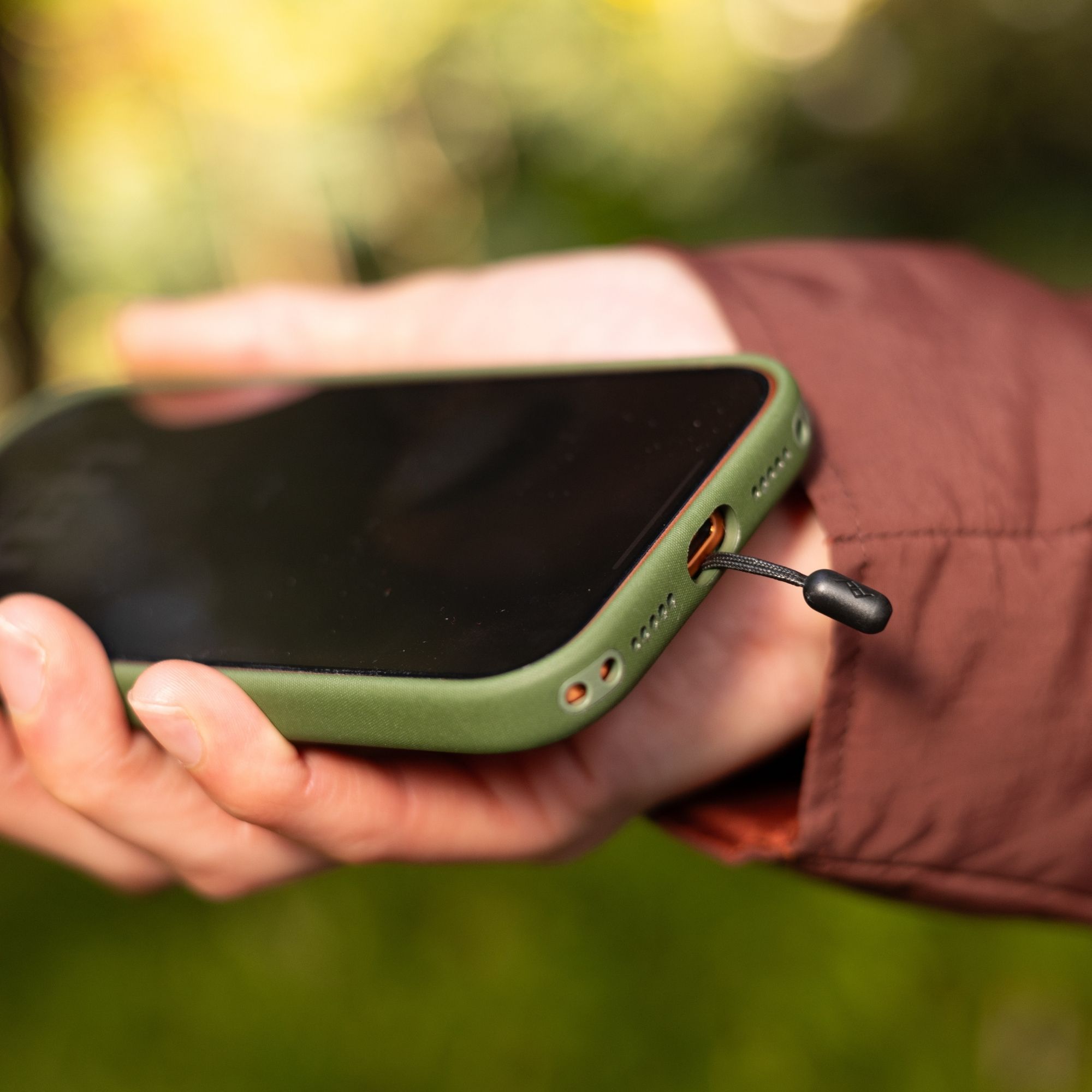 Der Mobile Strap Adapter funktioniert mit den meisten Smartphone-Hüllen von Drittanbietern. Voraussetzung ist eine vollständig umschlossene Ladeanschlussöffnung, durch die die Adapter-Schlaufe geführt werden kann. So kannst Du Dein bestehendes Setup weiterhin nutzen und Dein Smartphone dennoch sicher mit einer Handschlaufe oder einem Tragegurt verbinden.