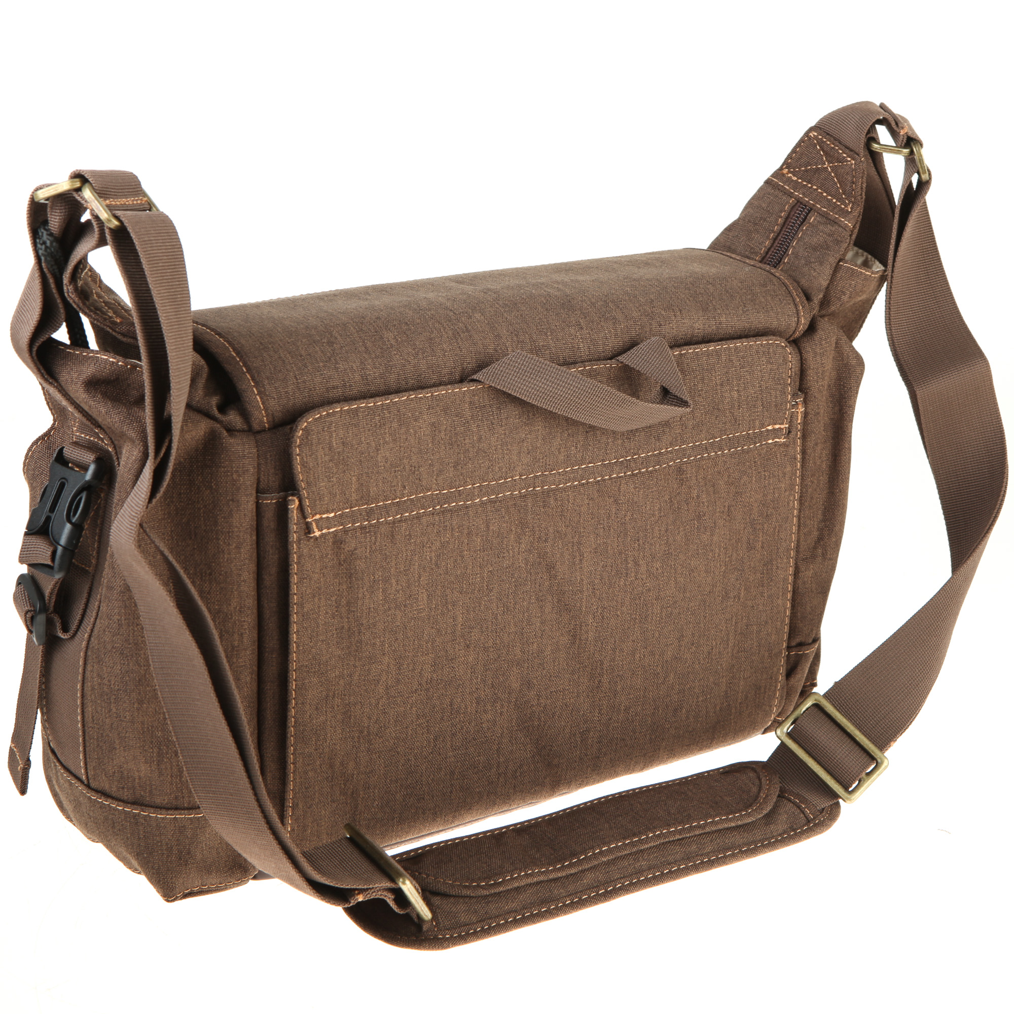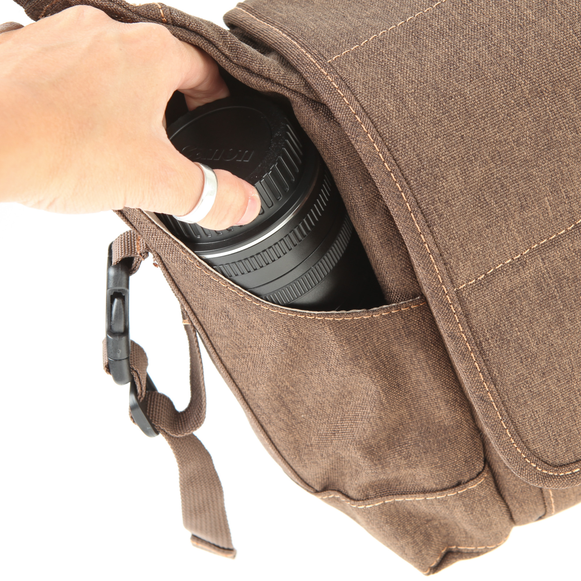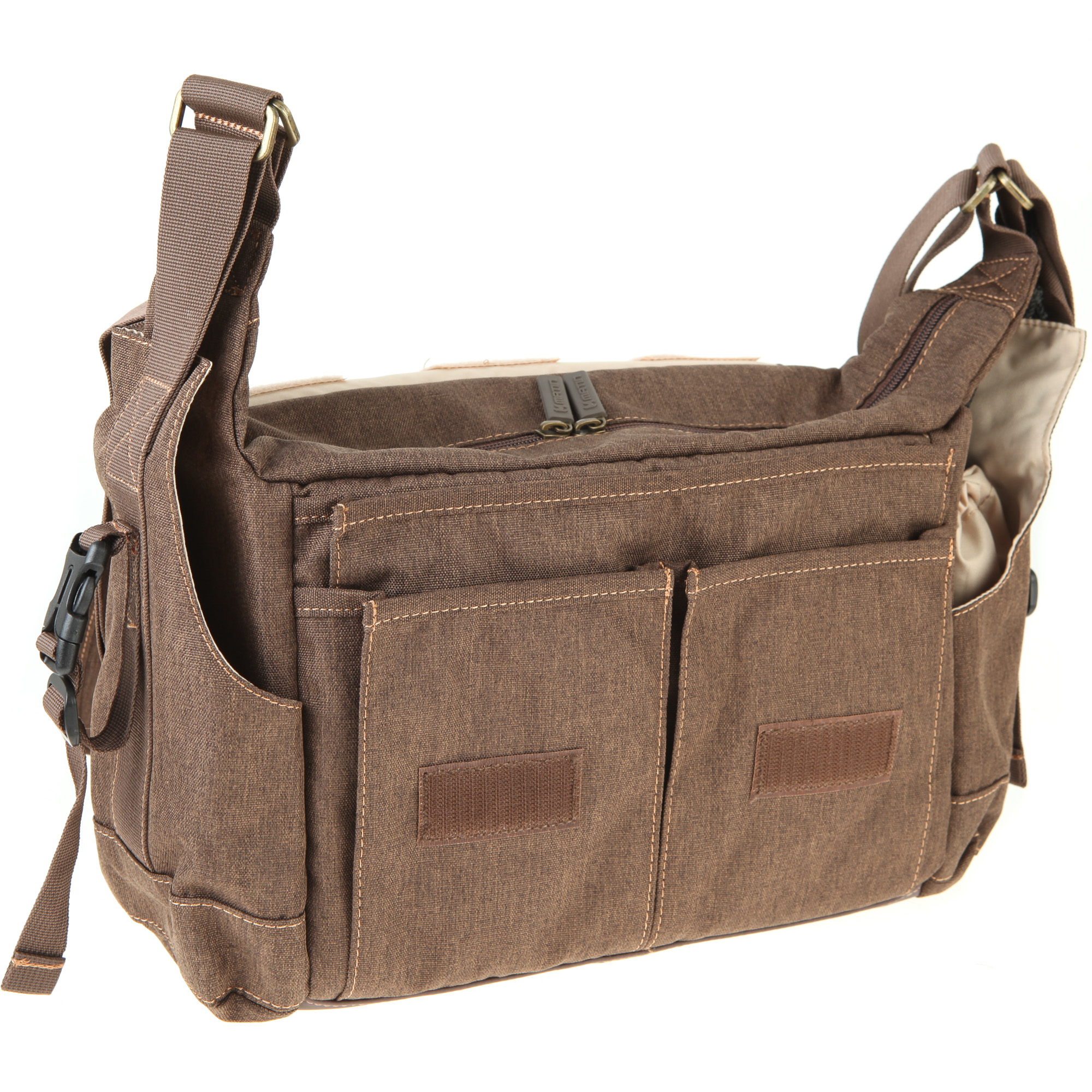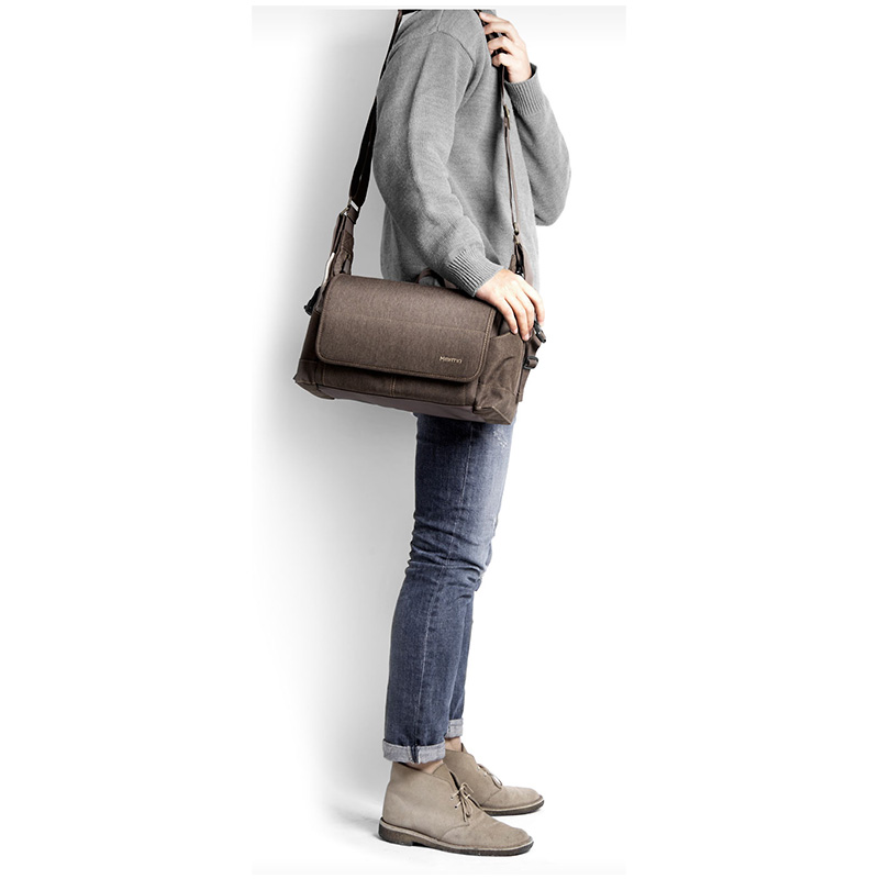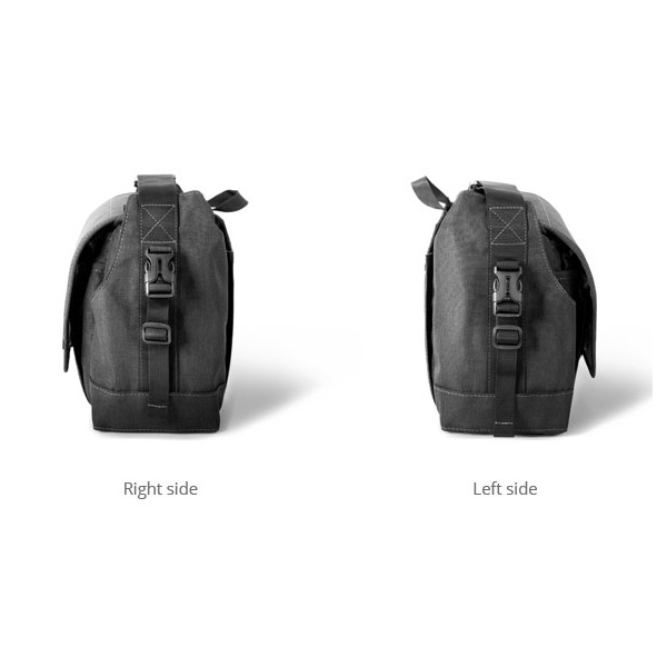 Die Tasche bietet zahlreiche Verstaumöglichkeiten für Zubehör wie Akkus, Filter, Speicherkarten oder Smartphones. An der Vorderseite der Tasche befinden sich insgesamt drei Einsteckfächer. Eines der Fächer erstreckt sich über die gesamte Breite der Tasche, während die anderen beiden in etwa halb so groß sind. Außerdem gibt es noch ein unterteiltes Reißverschlussfach und zwei kleine Klettfächer für Speicherkarten. An den beiden Stellen, an denen der Schultergurt in die Tasche übergeht, befindet sich jeweils ein Einsteckfach. Die Fächer sind perfekt in das Taschendesign integriert. Sie sind groß genug für eine Trinkflasche.Und last but not least: Auf jeder Taschenseite gibt es mit Steckverschlüssen versehene Schlaufen zum Festmachen von Zubehör.
