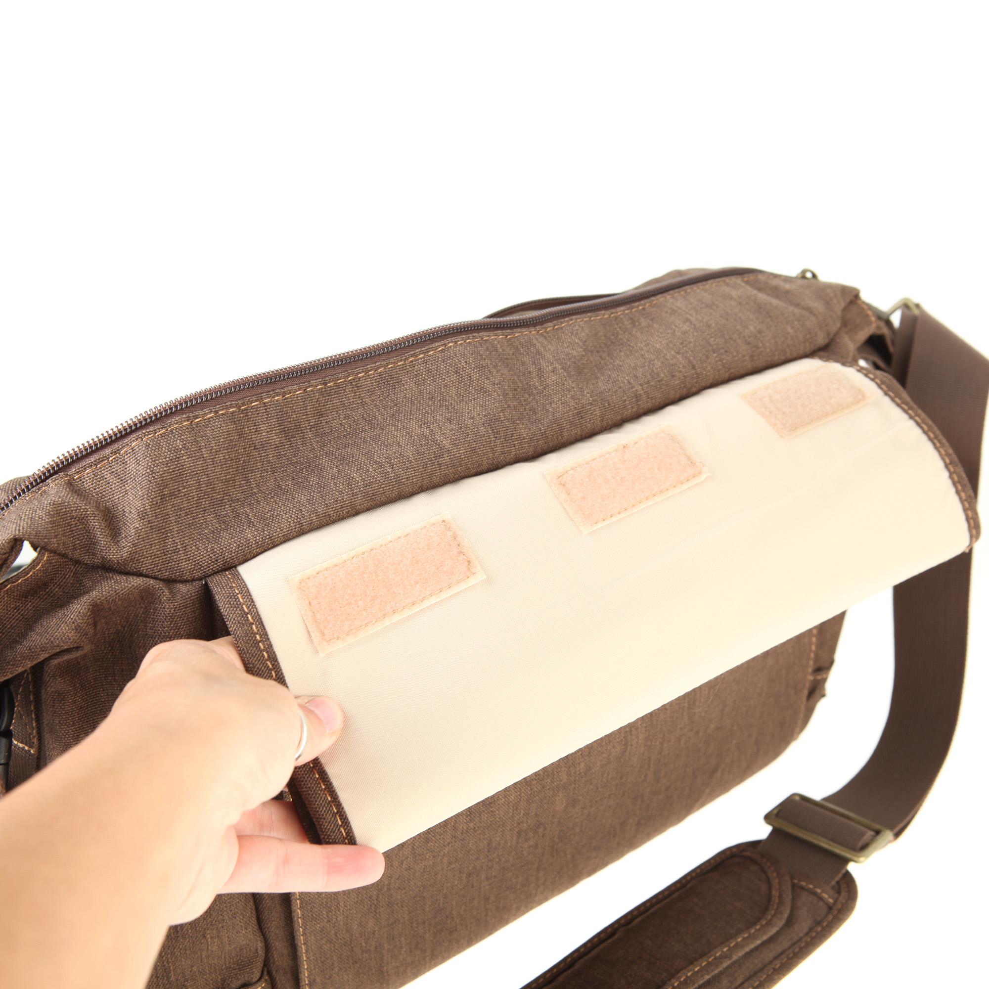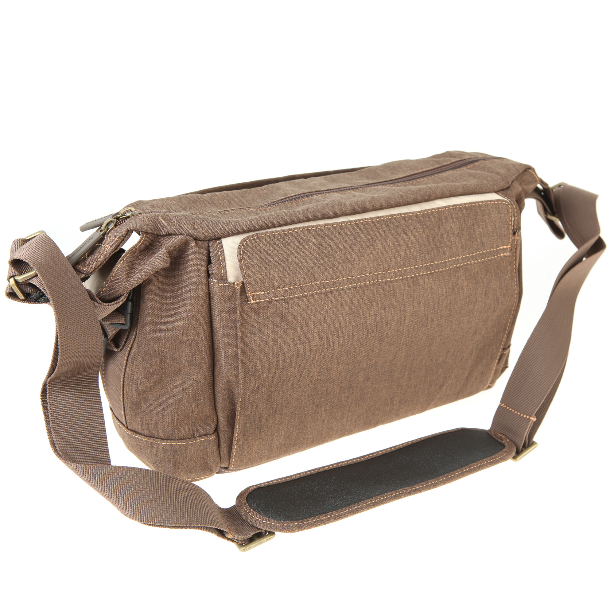 Der fest mit der Tasche verbundene Schultergurt ist längenverstellbar. Die maximale Länge beträgt ca. 180 cm. Der Gurt ist mit einer abnehmbaren Schulterauflage ausgestattet. Die Auflage ist relativ breit und leicht gepolstert. Die Schulterauflage lässt sich entlang des Gurts verschieben, damit man ihre Position an seine individuellen Bedürfnisse anpassen kann. An der Unterseite der Schulterauflage befindet sich eine rutschfeste Gummifläche. Die Gummifläche verhindert, dass die Tasche von der Schulter rutschen kann.