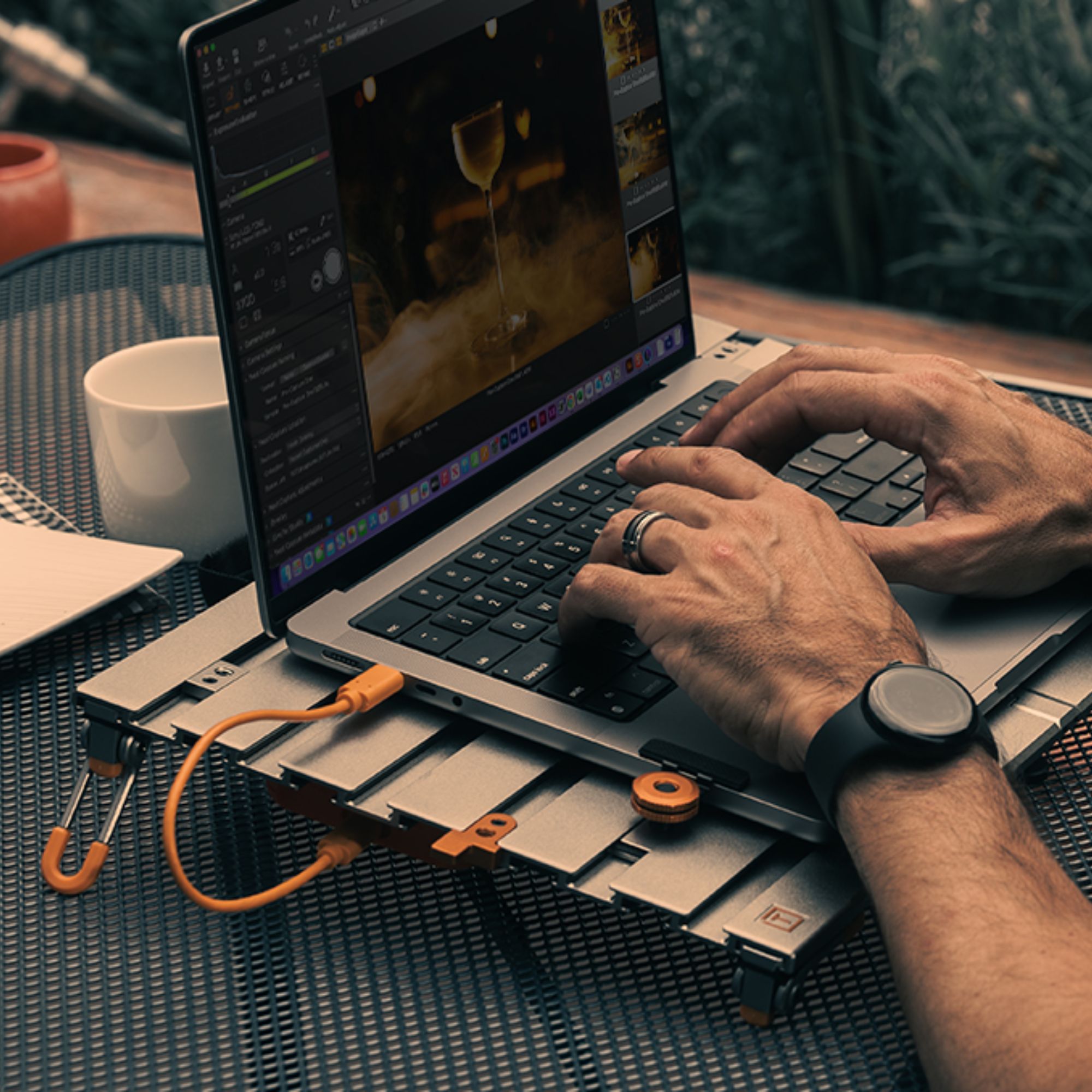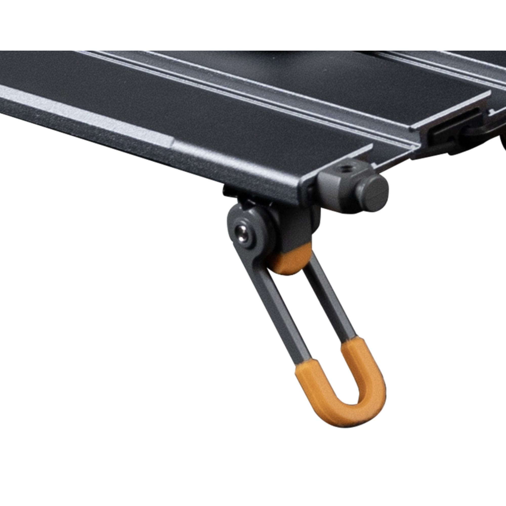 Die Beine bestehen aus robustem Metall und verfügen über rutschfeste Gummierungen, um empfindliche Oberflächen zu schützen. Ob auf einem Schreibtisch, einem Transportkoffer oder direkt auf dem Boden – deine Workstation bleibt sicher und stabil.