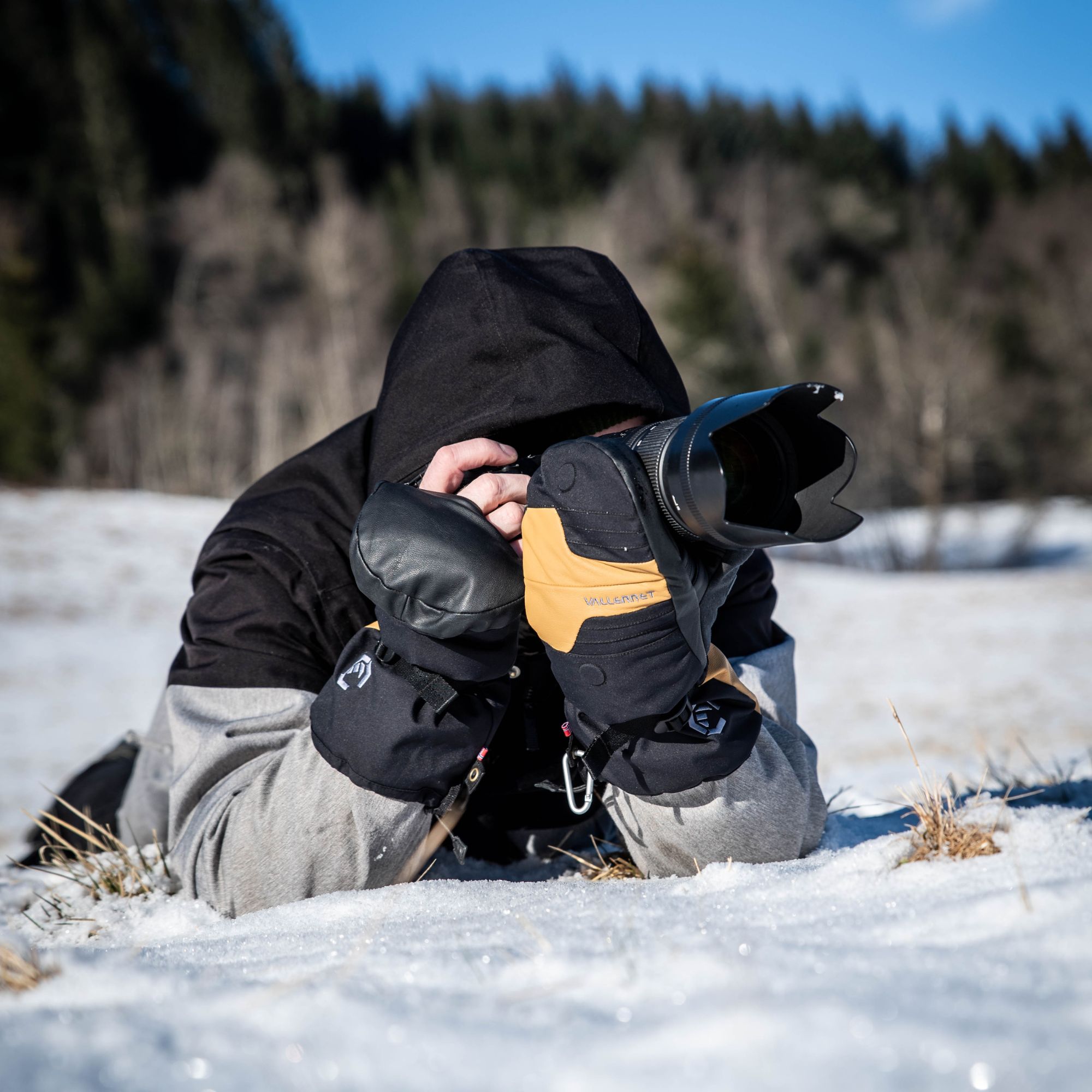 Der Senja Mitt ist ein Hochleistungs-Fotohandschuh für extreme Winterbedingungen – mit sturmsicherem Design und wirkungsvoller Wärmeisolierung auch im tiefen Schnee.